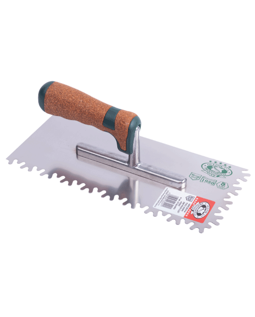PLAČIAUDantyta trintuvė pagaminta iš aukštos kokybės nerūdijančio plieno. Specialios formos dantų dėka užtikrina 100% klijų užpildymą po plytelėmis. Idealiai tinka plytelėms ir akmeniui klijuoti prie fasadų, šildomų grindų, balkonuose, terasose, laiptų pakopoms ir aikštelėms.