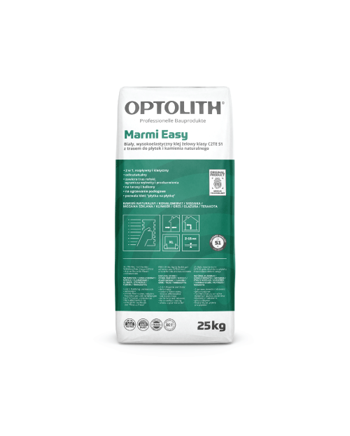 PLAČIAUOptoflex Marmi Easy, tai aukštos kokybės geliniai labai elastingi plytelių klijai. Skirti klijuoti visų tipų keramines, akmens masės, klinkerio, natūralaus akmens, konglomeratų ar stiklo dangas, ypač rekomenduojami natūralaus akmens plytelėms, stiklo mozaikoms ir klinkerio plytelėms. Easy serijos klijai pasižymi labai mažomis sąnaudomis.